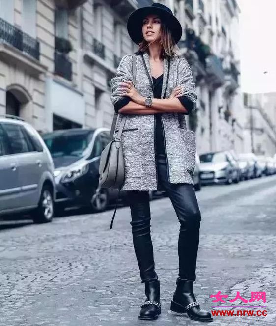 黑色皮褲搭配短靴帥氣十足,外搭一件灰色針織開(kāi)衫和寬沿禮帽,慵懶隨性。