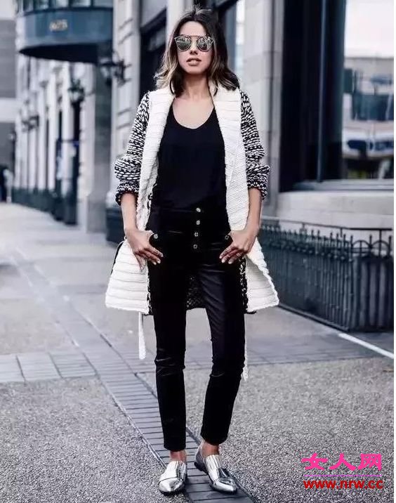 all black內(nèi)搭外加一件拼接針織衫,再加一雙銀色樂(lè)福鞋,讓造型元素不會(huì)太過(guò)單調(diào),時(shí)尚感十足。