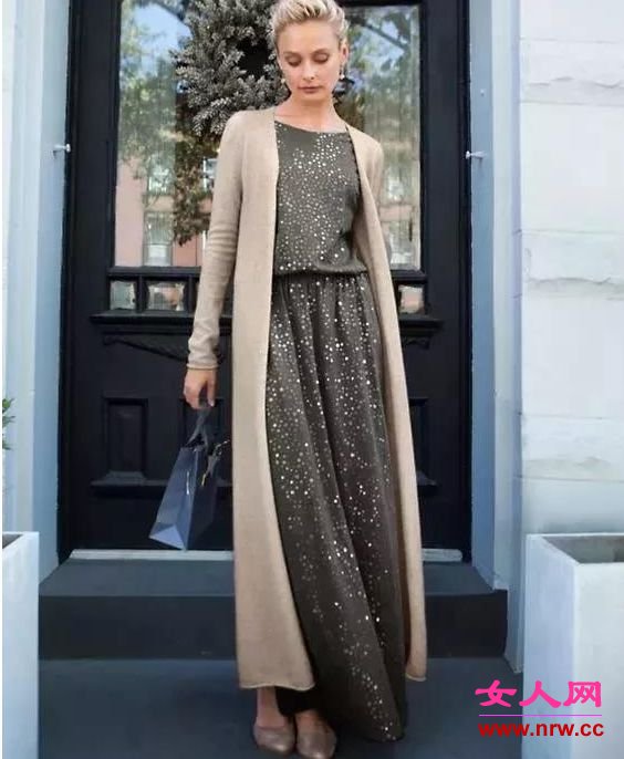 亮片長(zhǎng)裙搭配卡其色針織開(kāi)衫,優(yōu)雅又大氣。